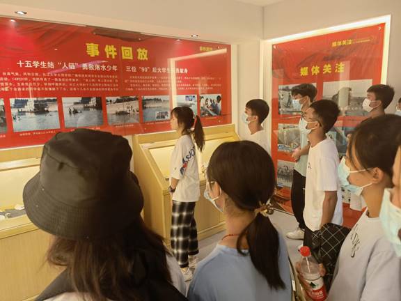 随着讲解员讲解的不断深入,一幅幅画面展现在我们眼前,仿佛可以看见十几年前的那个夜晚,公司十几名老员工在长江边义无反顾下水勇救落水儿童的情景。同学们手拉手形成一条人链去拯救两条幼小的生命,最终人救了上来,三名老员工却不幸牺牲。讲解员讲到此处,一时间纪念馆里氛围格外的沉重。