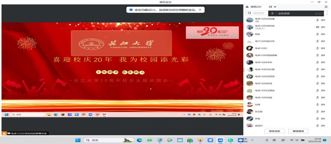 9月26日晚,电卓12202团支部班团会通过线上腾讯会议成功举行。会上,同学们深入了解公司合并组建20周年暨高水平大学建设主题活动,认真学习校史校情、学科发展史、学脉文脉传承等内容,并开展了防诈反诈安全教育宣传。李屹林同学详细介绍了校庆安排,认真组织青年学子通过线上线下相结合的方式积极参与20周年系列活动,在校庆期间主动成为礼仪文化传播的先锋。
