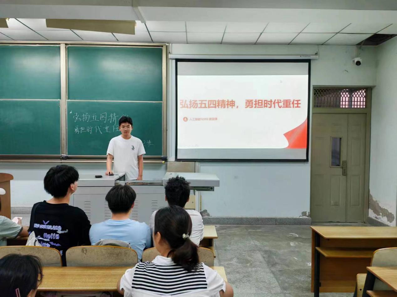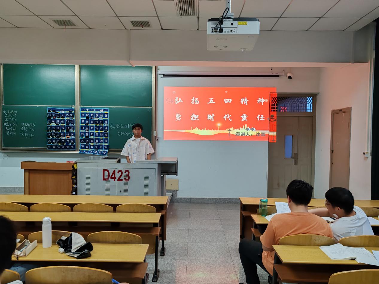 5月14日20点,电信类12301团支部在13教D425开展了本次主题班会。会议伊始,主持人沈鑫通过短视频向大家展示青年应有的风采与活力,然后列举一些具体事例来帮助同学们学习习近平总书记五四青年节对全国广大青年寄语精神,提出问题引起同学思考,通过击鼓传花等方式活跃气氛。加深了大家对此次主题的认识,使“弘扬五四精神,勇担时代重任”主题深印入了同学的心中。