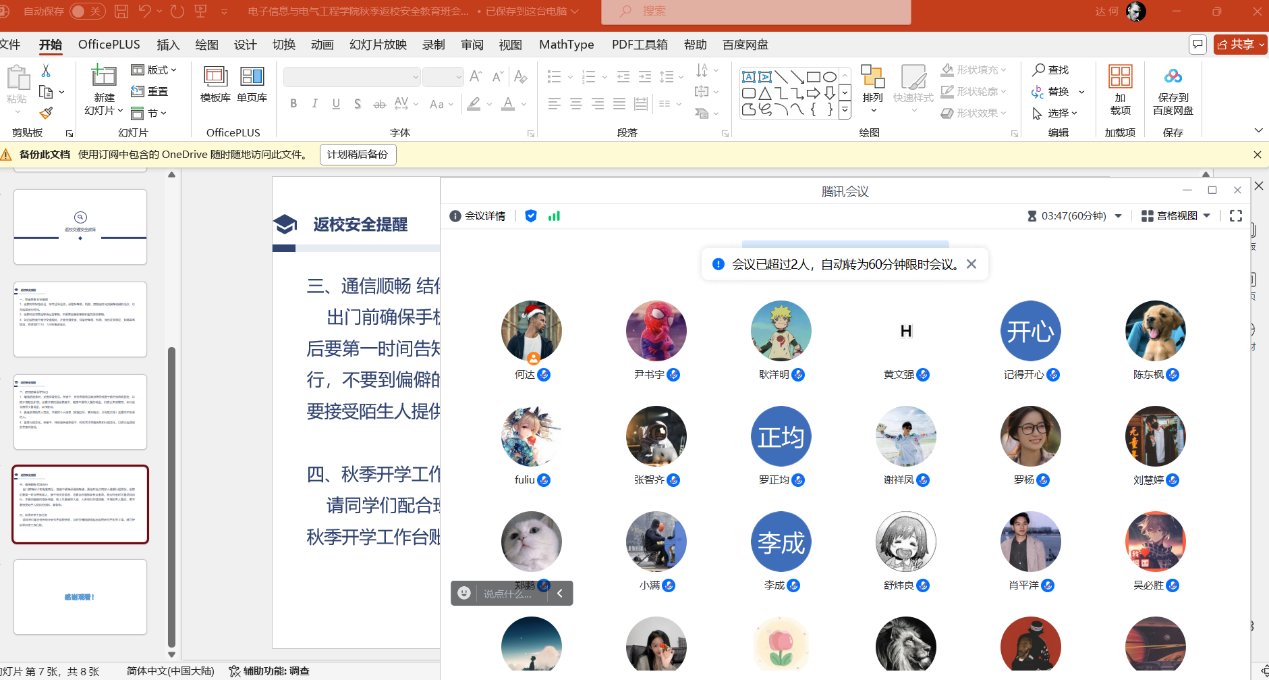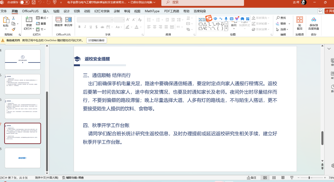 为确保公司秋季学期开学工作平稳有序,根据44118太阳成城集团党委员工工作部、党委研究生工作部《关于开展2024年秋季开学前主题班会的通知》的要求,44118太阳成城集团于2024年8月20日至8月22日期间召开了研究生的开学安全主题教育班会。 本次主题班会主要围绕新生开学线上报到流程及注意事项;员工来校前安全教育(消防、交通、人身、财产安全,防诈骗、溺水、校园欺凌、毒品等),加强网络文明建设教育;秋季开学员工报到返校要求、开学上课、补考注意事项等几个方面开展教育。 (审核 康玮 编辑 康玮)