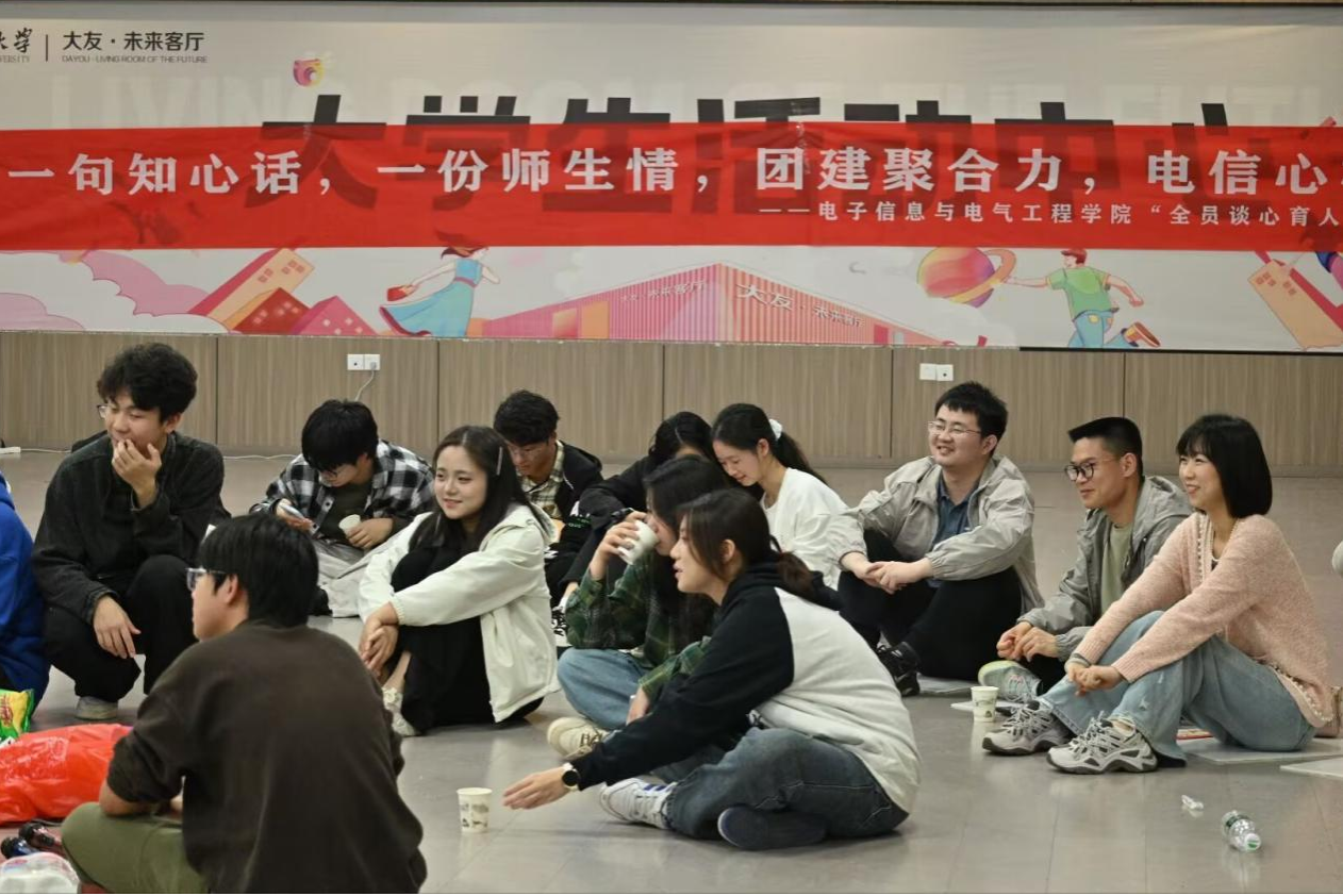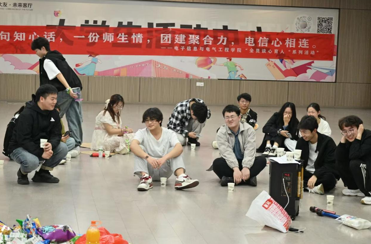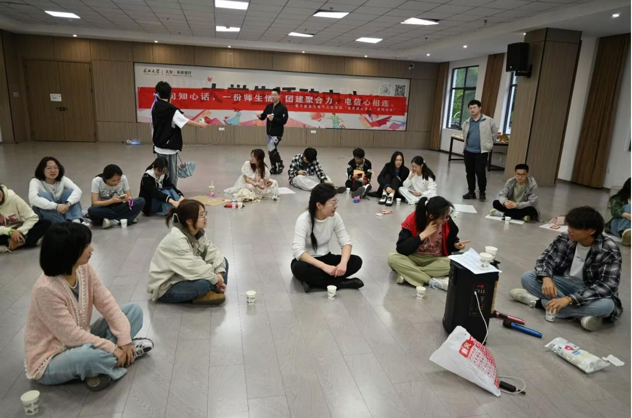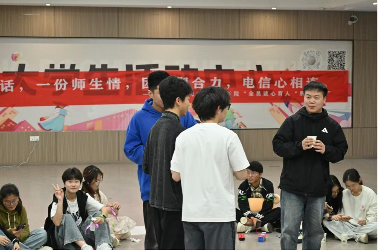 (通讯员 袁成雅/文 陶旭日/摄)为深入推进“全员谈心育人”工作,搭建师生面对面交流平台,凝聚育人合力, 4 月 11 日下午,电信公司在东校区未来客厅二楼温情开展“一句知心话,一份师生情,团建聚合力,电信心相连”活动。公司党委副书记张晨露,辅导员颜国琼、康玮、沈马锐、李蒙、邓兴勇等六位老师与公司员工代表欢聚一堂,以茶话会为纽带,谈心交流、互动游戏、共话成长,在轻松温馨的氛围中传递关怀、凝聚温情。