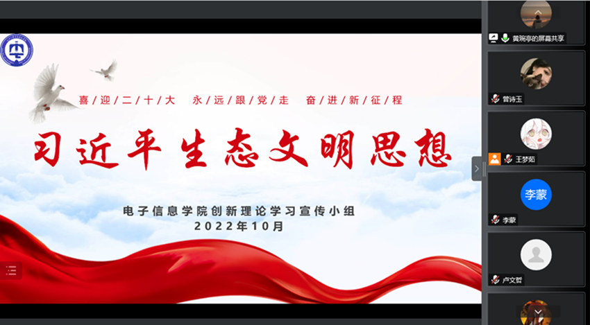 (通讯员 曾诗玉)为深入学习贯彻习近平新时代中国特色社会主义思想,引导同学们喜迎二十大,奋进新征程,同时更好地宣传学习小组的学习成果,电子信息公司员工创新理论学习宣传小组于10月9日下午通过线上方式连续展开创新理论学习小组宣讲活动。主讲人为校青马班学员、公司员工创新理论学习宣传小组成员黄婉亭,辅导员李蒙、信卓12101班团支部、人工智能12103团支部全体同学参会。