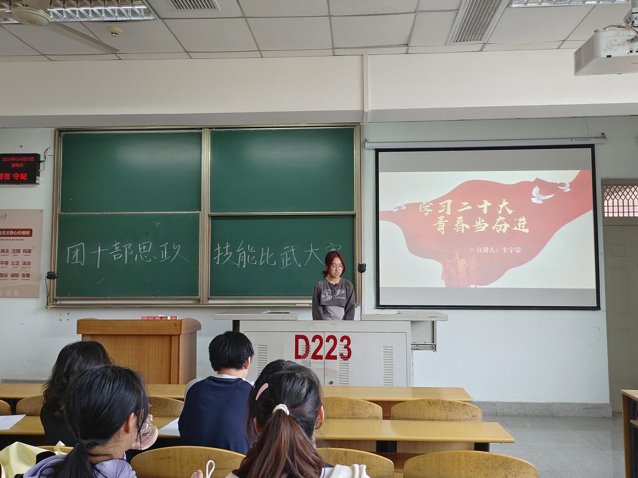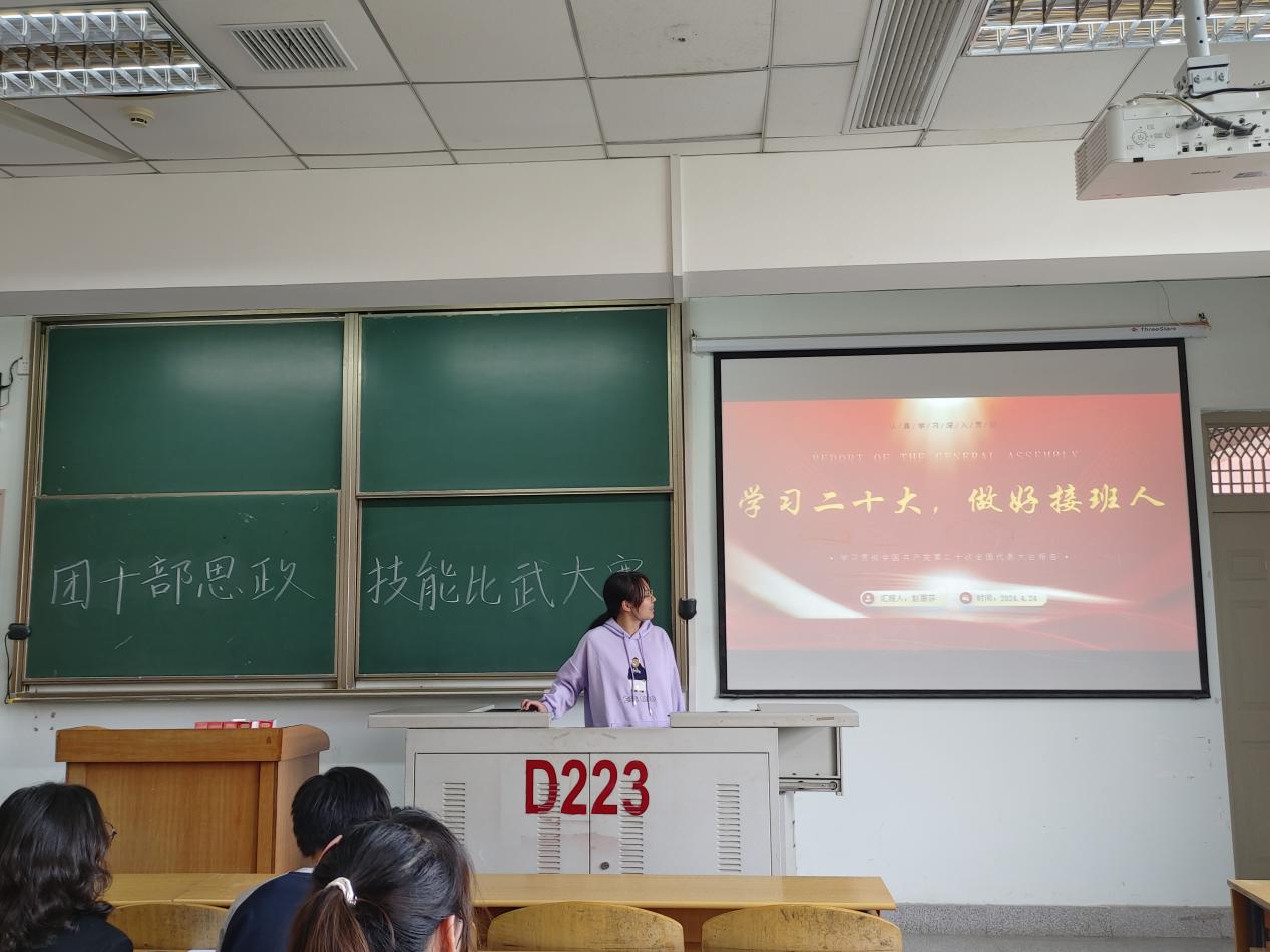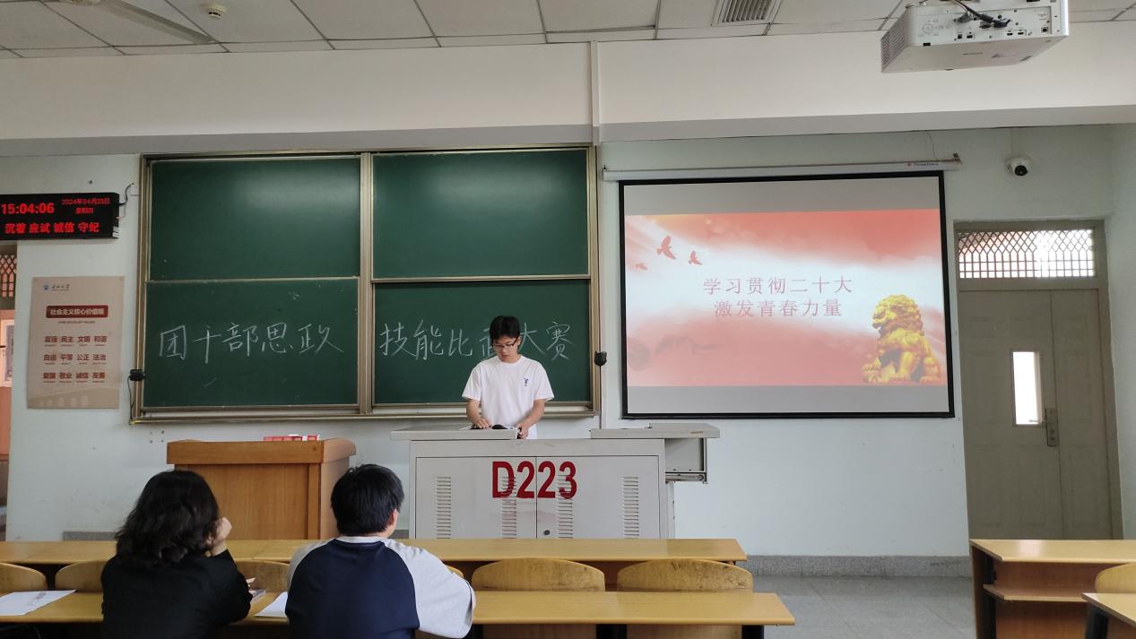 本次基层团干部专项赛要求2022级、2023级各班团支部派一名及以上员工干部参加,2020级和2021级各班团支部自愿报名参加。本次竞赛包含理论知识竞赛和主题团课展示两部分,其中理论知识竞赛为线下闭卷答题,题型包括选择题、填空题;主题团课展示要求参赛选手依据《团干部思政技能大比武主题团课备赛指南》,紧扣“学习贯彻党的二十大精神”主题,以PPT形式展示一节主题团课。两部分各占总成绩的50%,最后电信类12302班牛宇蒙同学以9.4分的综合成绩获得本次基层团干部思政技能大比武的第一名。