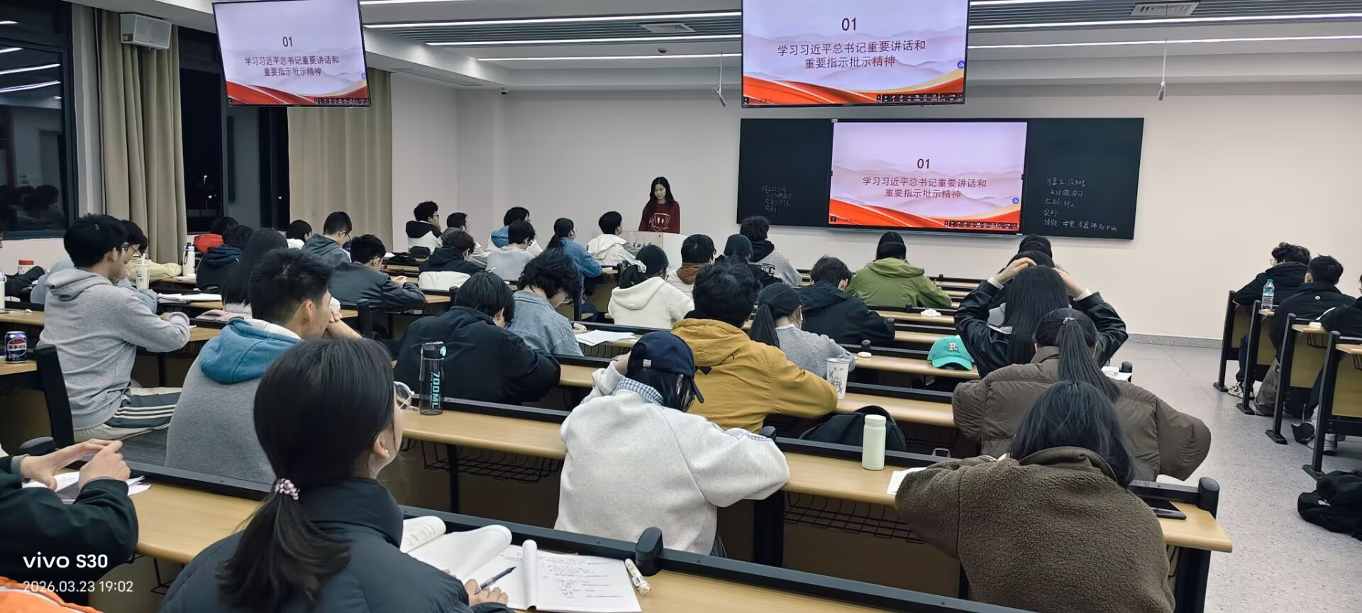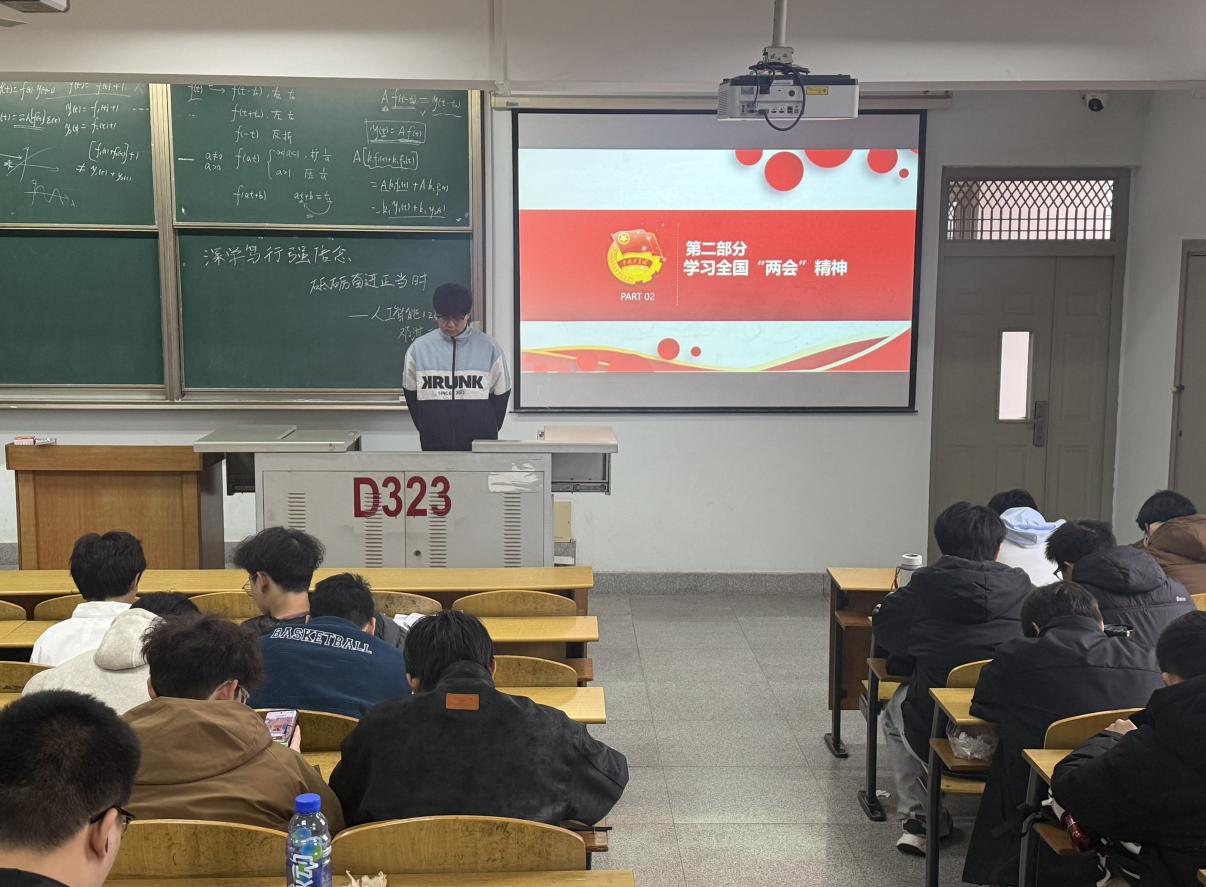 人工智能12402班于3月20日晚在13教D323召开主题班会。在班会上,主持人邓淇元以集中学习、专题研讨、交流分享等形式,组织团员青年深入学习习近平总书记重要讲话和重要指示批示精神,深刻领会核心要义、精神实质与实践要求。同时,围绕2026年全国两会精神开展专题学习研讨,聚焦“十五五”开局起步、高质量发展、青年担当等重点内容,引导青年把思想和行动统一到党中央决策部署上来,切实把学习成果转化为干事创业的实际行动。