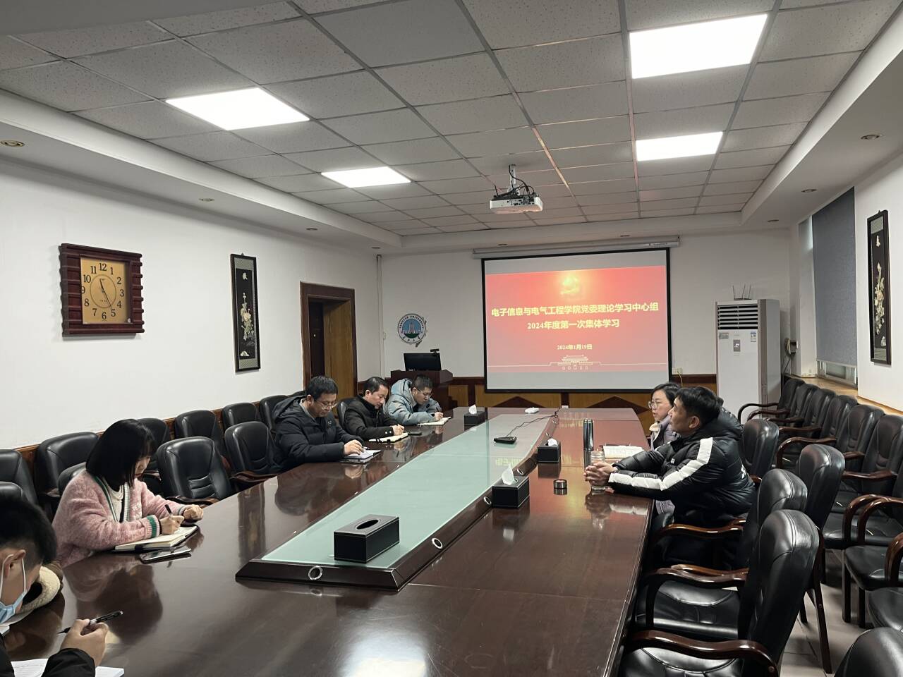 1月19日上午,电子信息与电气工程公司党委理论学习中心组在10教205会议室召开2024年度第一次集体学习会,党委书记郭梅主持会议。