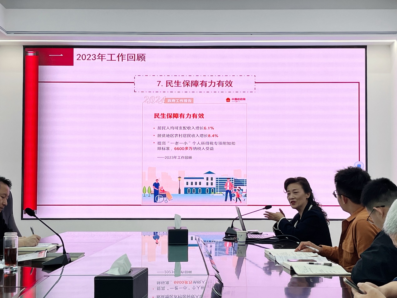 贾廷秀教授以“团结凝聚力量 奋斗铸就伟业”为题开展深入学习领会全国两会精神专题宣讲。宣讲会上,贾廷秀教授围绕2023年的工作回顾、2024年经济社会发展的总体要求和政策取向以及2024年政府工作任务3个方面,数字化、全景式、多维度解读了全国两会精神;她还重点介绍了全国两会关于科教兴国的有关要求,结合公司的学科专业特点,解读了新质生产力的内涵。整场授课主题鲜明、层次清晰、内容丰富,具有很强的政治性、思想性和启发性。经理罗明璋表示,贾廷秀教授的宣讲给我们启发很大,我们要深入学习领会全国两会精神,力争在推进现代化产业体系建设、发展新质生产力的过程中做出电信公司应有的贡献。