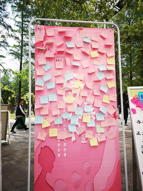 活动期间,超过500位同学积极参与进来。同学们在摆点处登记信息,领取信封,同时还领取了一份小礼物,摆点处前经常站满了等待参与活动的同学。接着同学们私下在信纸上写下平日未能对母亲说出的感恩的话语,将这些话封于信封里,于5月10日前投入信箱,然后由电子信息员工会组织部在活动结束后对信进行整理后将他们的感恩之语全部寄送出去。在摆点处旁还立着一面爱心墙,爱心墙上承载了同学们对母亲的思念与祝福,满满的便利贴陈述着他们满满的爱。