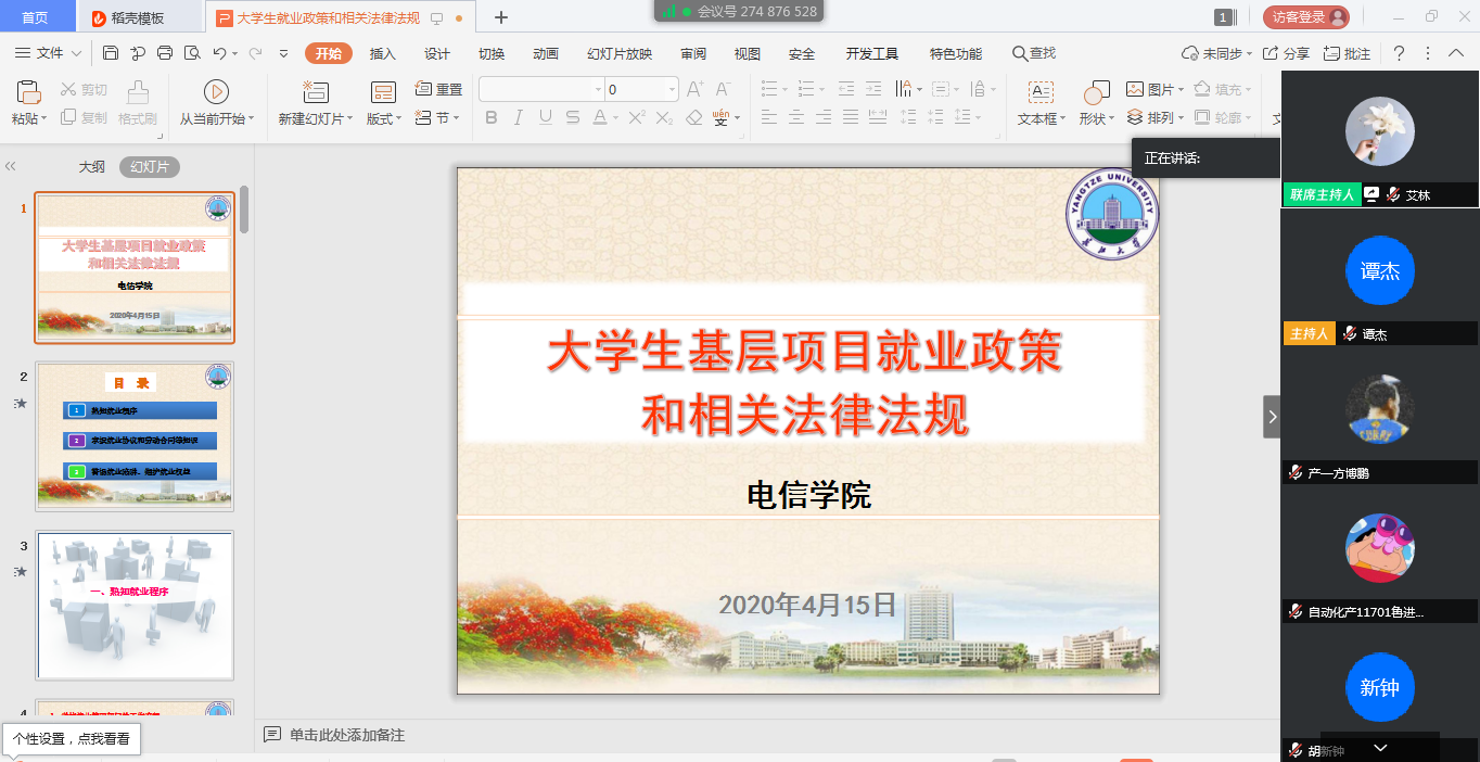 4月15日下午4点,电子信息公司利用腾讯会议开展4月份就业指导活动,通过政策宣讲和解读,促使毕业生熟悉国家就业政策和公司就业管理规定。近300名员工参加会议,活动由就业专干艾林老师主持。
