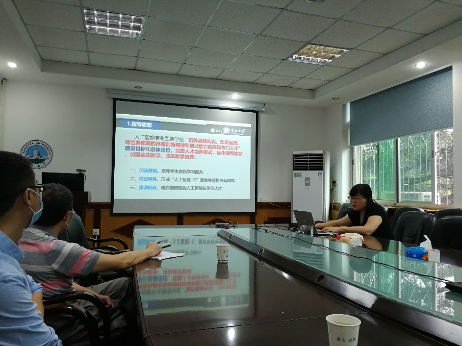 公司在2019年上半年已经开始着手人工智能专业申报的准备工作,调研了已有该专业的其他高校的人工智能专业的培养计划、课程体系和实施方案,论证了电信公司以现有的基础时可以完成人工智能专业人才培养的要求的。在公司的的统筹安排下,成立了以孙祥娥教授为首人工智能专业申报小组,先期完成了人工智能专业设置申报书和专业建设规划。本次会议首先听取了孙经理关于专业申报的前期工作汇总报告,接着讨论了专业申报答辩的材料准备工作,明确了公司在该专业申报上的义不容辞,且公司的团队建设、办学经验、人才质量等方面的优势明显。最后就汇报PPT的组织上,大家群策群力,具体到图表数据的组织和展示方式。