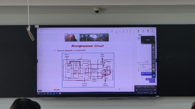 作为该专业首个美方授课学期,本次课程采用了全英文讲授专业核心知识。屏幕上,Professor Hou以组合逻辑电路和时序逻辑电路的定义切入,结合ALU、寄存器等实际应用场景,逐步引出微处理器中数据通路与控制单元的分工逻辑。虽然同学们首次面对全英文专业课讲授略显紧张,但大家都兴致满满,跟随板书节奏认真记录笔记。“老师讲解很清晰,但全英文的技术术语连在一起,反应速度还是跟不上。”课后,一位同学坦言。这也是课堂上多数同学的共同感受——美方教师授课逻辑严谨、互动自然,但对习惯于中文教材的员工而言,听力与专业知识的同步理解仍需时间适应。