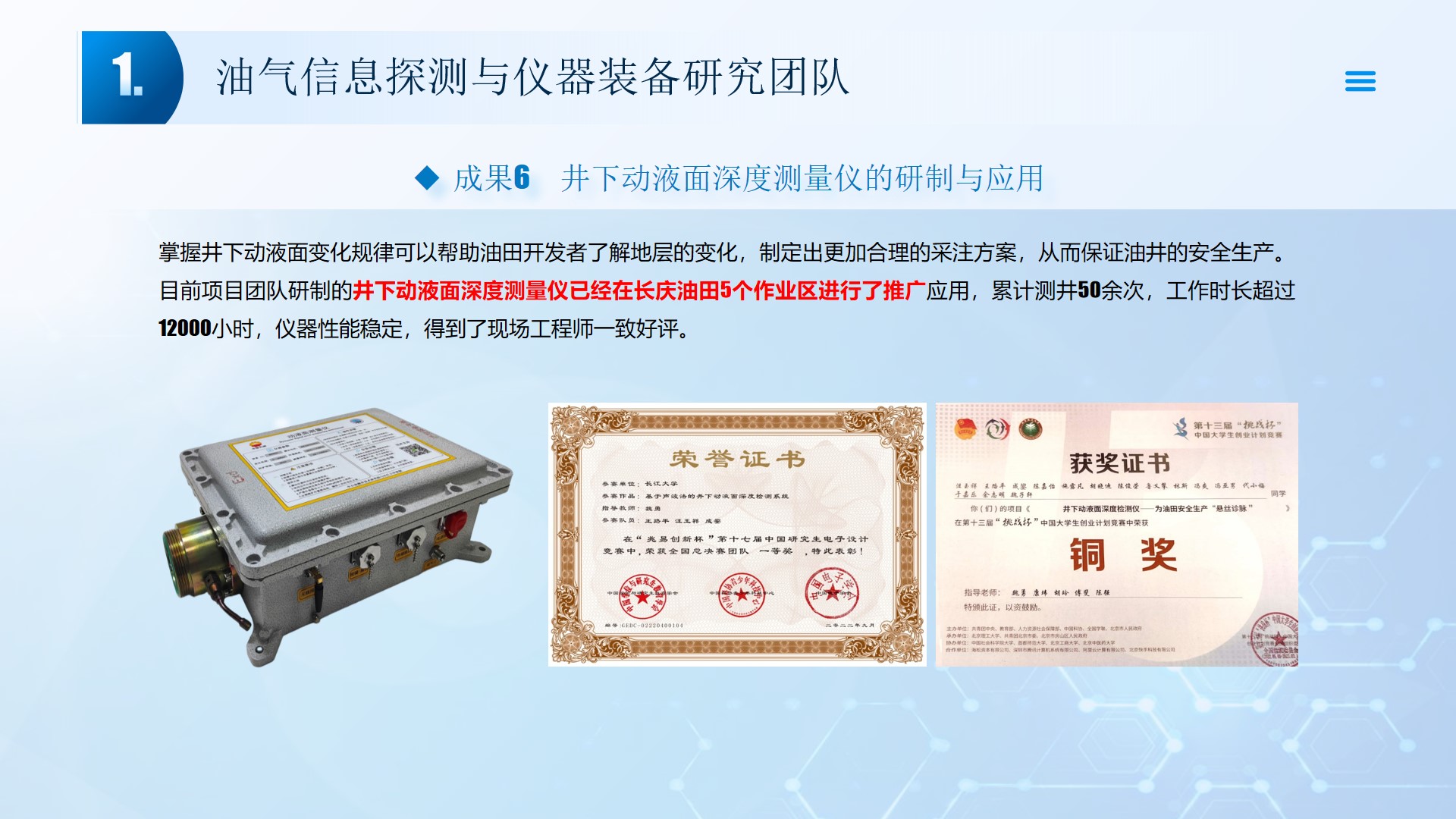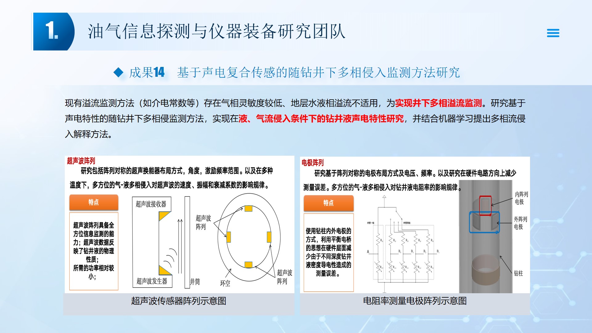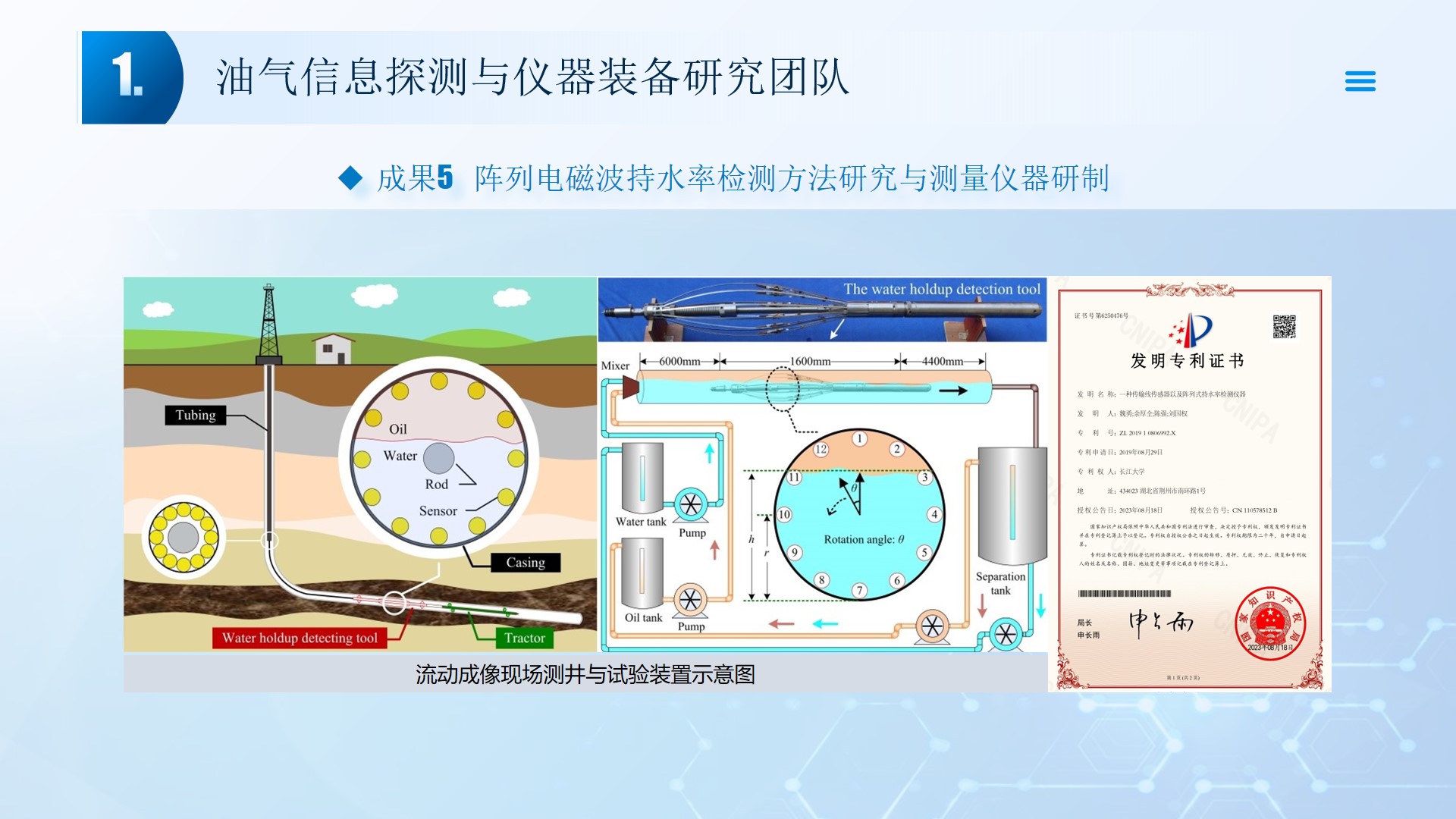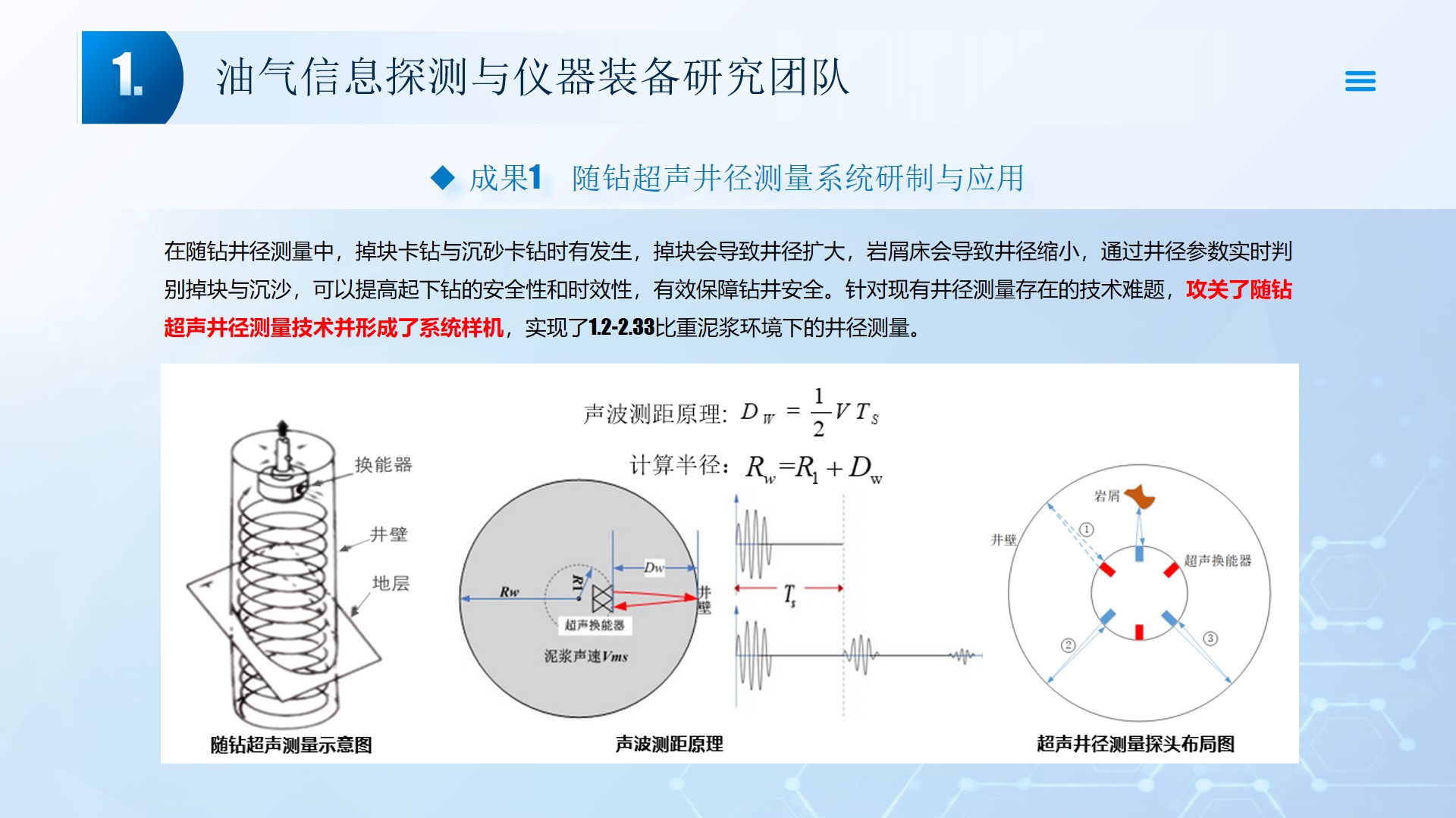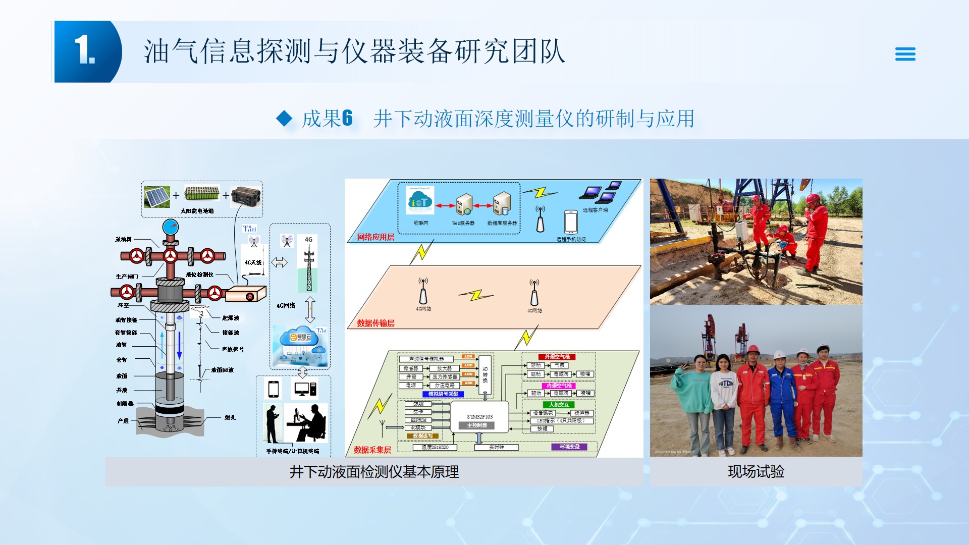 围绕声、电探测关键技术(传感器、声传播理论、仪器装备、数据处理及解释等),团队成员主持国家自然科学基金4项、湖北省自然科学基金6项、中石油创新基金4项及横向课题100余项。在《中国科学:地球科学》、《 Journal of petroleum science and engineering 》等石油领域权威学术期刊发表论文200多篇,出版专著4部,授权专利20余项;获省部级科技进步奖5项。团队开展了全频段、多尺度声波传感器及声学探测方法研究,并将相关技术整合研发了系列装备,以随钻井径测量系统、随钻数据压缩系统、远探测信号激励系统、多功能井下信号格式转换短节、便携式电火花震源、气枪控制系统为代表的成果已在油田现场取得了良好的应用效果。
