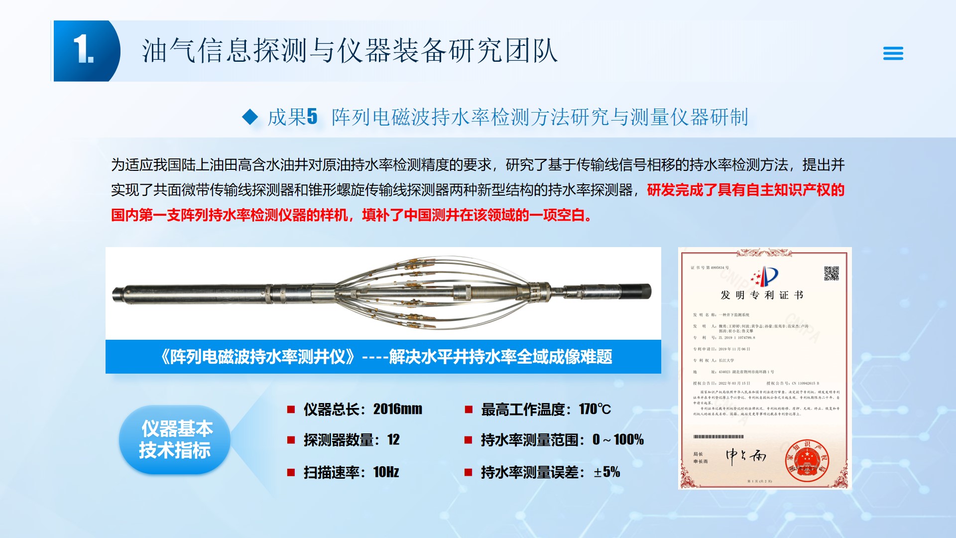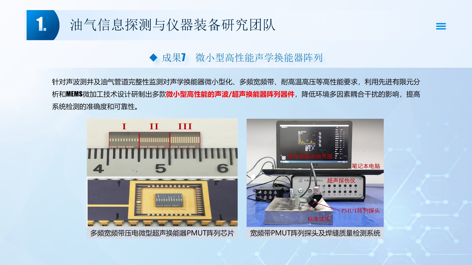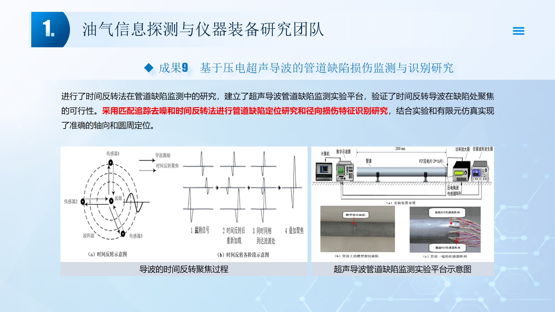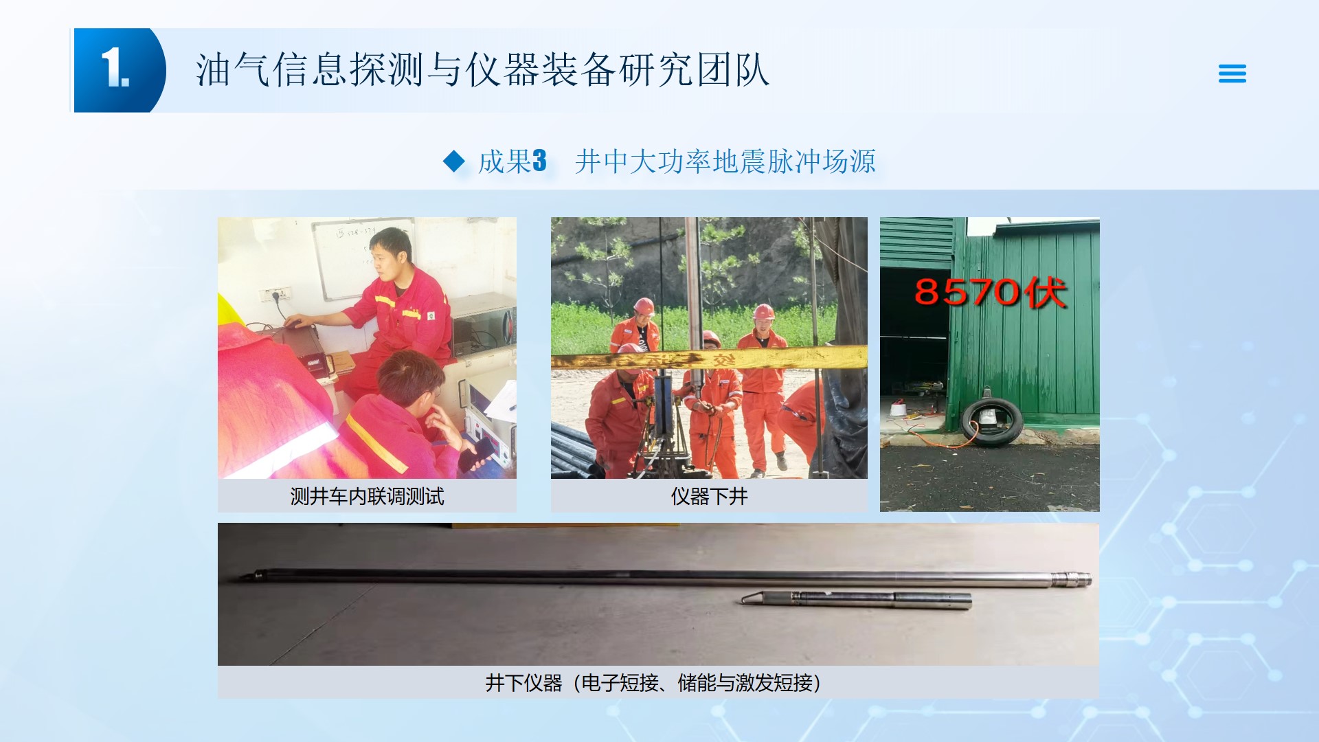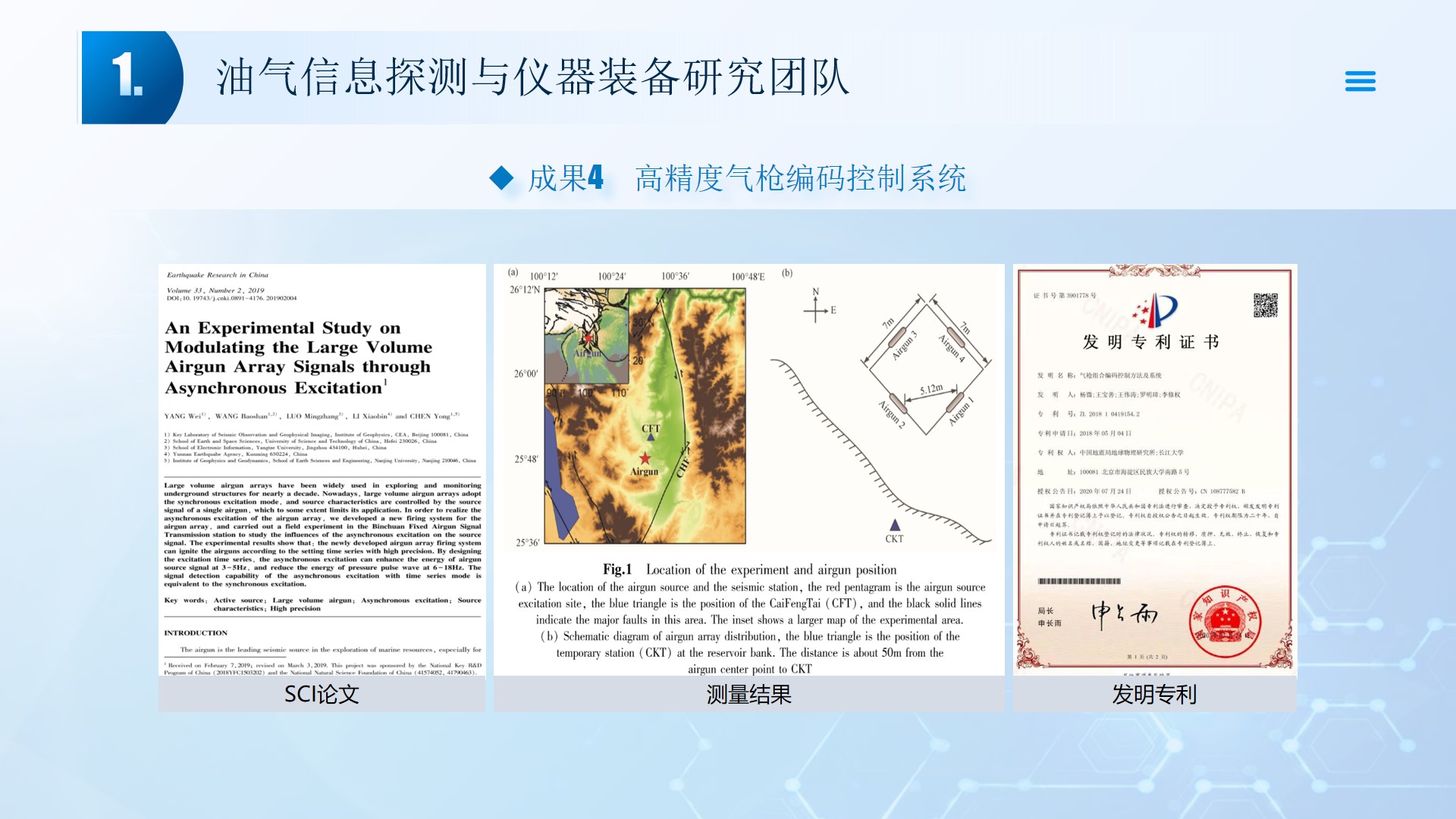 围绕声、电探测关键技术(传感器、声传播理论、仪器装备、数据处理及解释等),团队成员主持国家自然科学基金4项、湖北省自然科学基金6项、中石油创新基金4项及横向课题100余项。在《中国科学:地球科学》、《 Journal of petroleum science and engineering 》等石油领域权威学术期刊发表论文200多篇,出版专著4部,授权专利20余项;获省部级科技进步奖5项。团队开展了全频段、多尺度声波传感器及声学探测方法研究,并将相关技术整合研发了系列装备,以随钻井径测量系统、随钻数据压缩系统、远探测信号激励系统、多功能井下信号格式转换短节、便携式电火花震源、气枪控制系统为代表的成果已在油田现场取得了良好的应用效果。