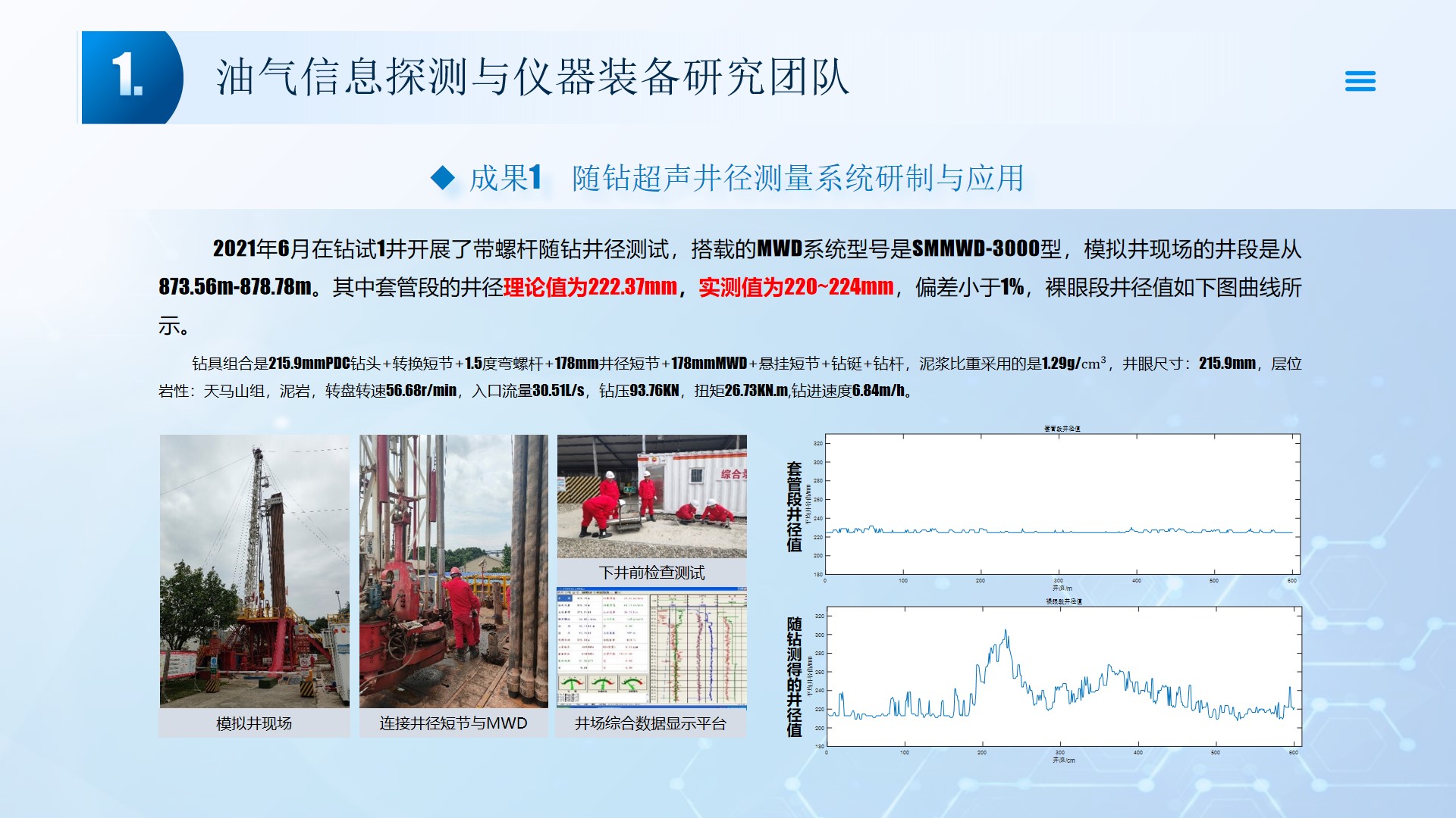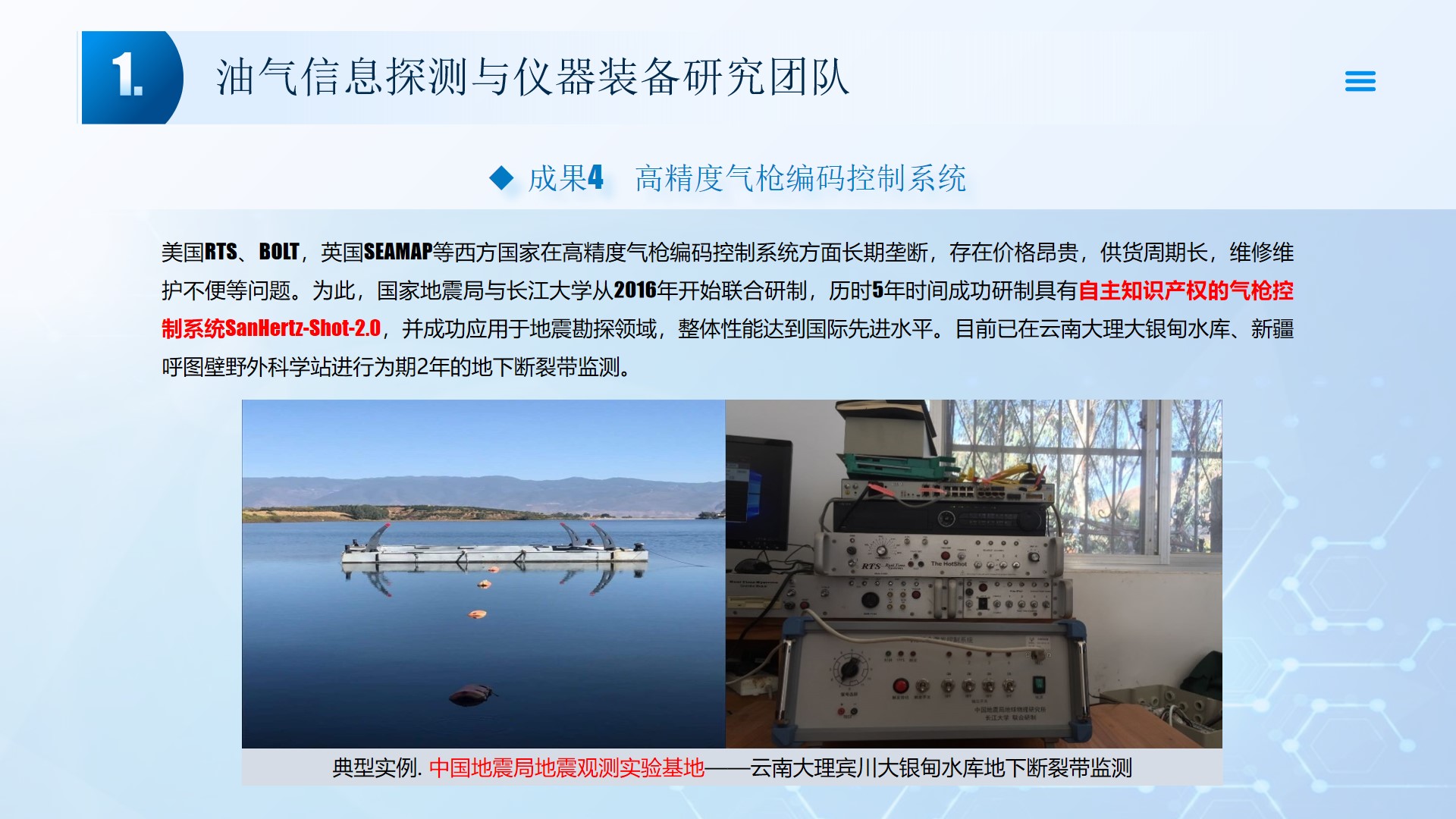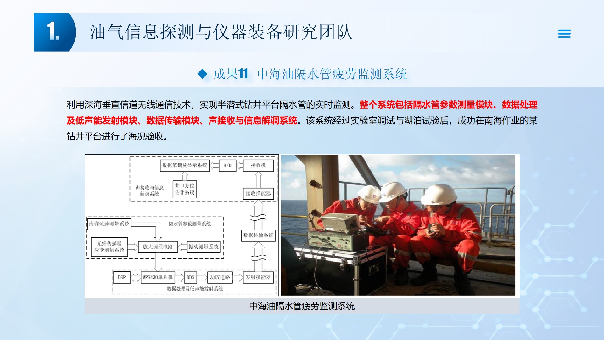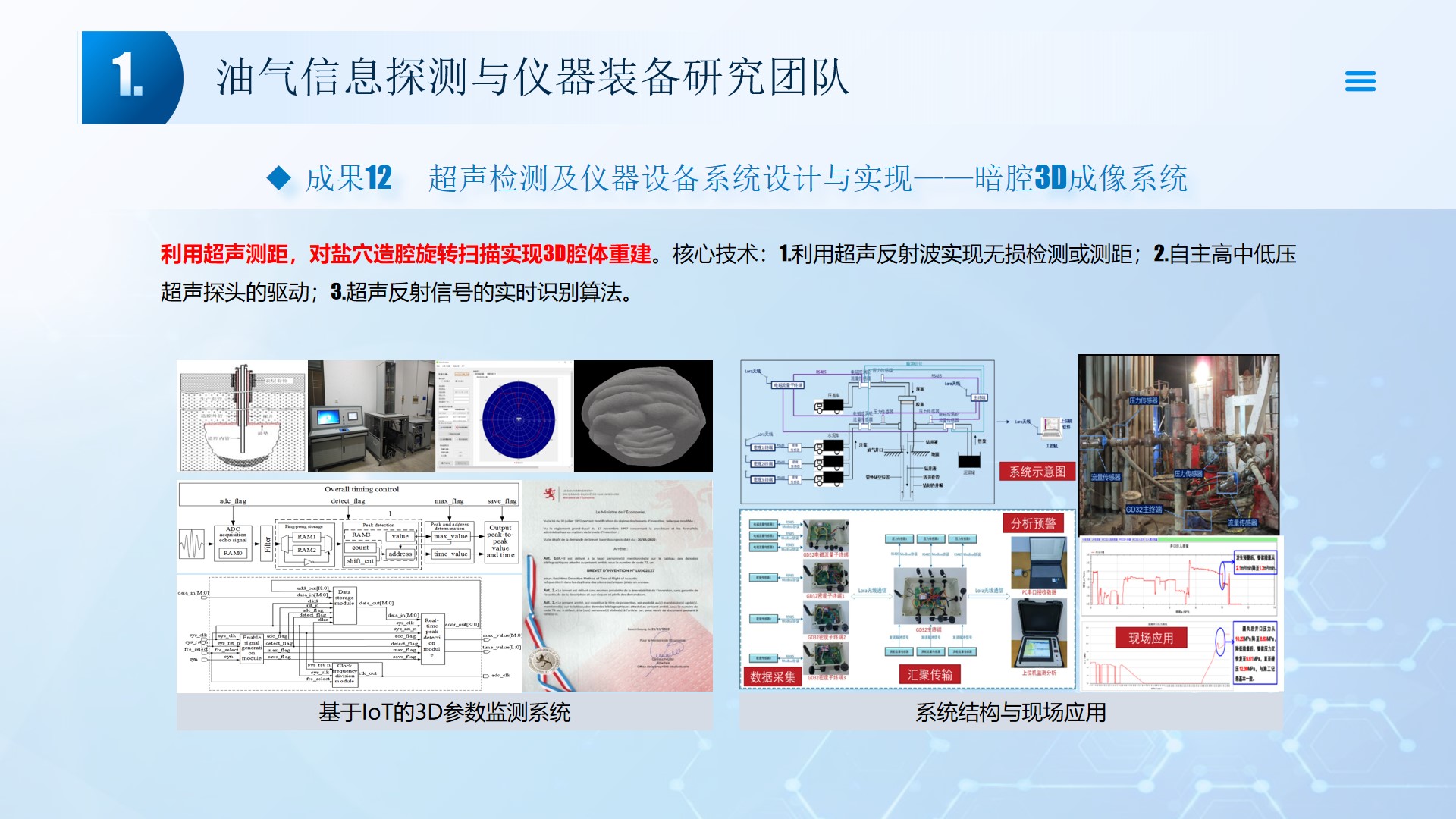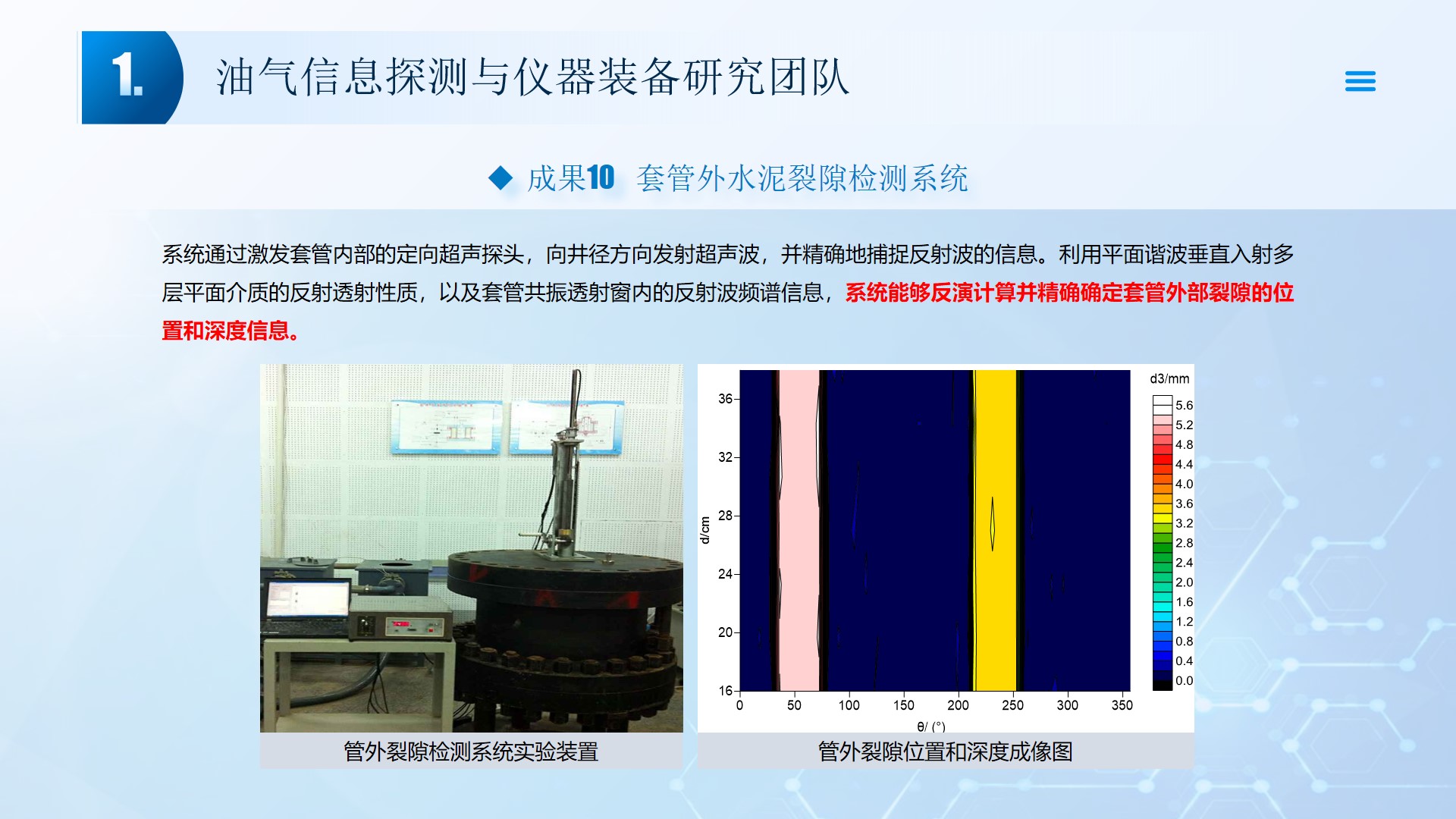 围绕声、电探测关键技术(传感器、声传播理论、仪器装备、数据处理及解释等),团队成员主持国家自然科学基金4项、湖北省自然科学基金6项、中石油创新基金4项及横向课题100余项。在《中国科学:地球科学》、《 Journal of petroleum science and engineering 》等石油领域权威学术期刊发表论文200多篇,出版专著4部,授权专利20余项;获省部级科技进步奖5项。团队开展了全频段、多尺度声波传感器及声学探测方法研究,并将相关技术整合研发了系列装备,以随钻井径测量系统、随钻数据压缩系统、远探测信号激励系统、多功能井下信号格式转换短节、便携式电火花震源、气枪控制系统为代表的成果已在油田现场取得了良好的应用效果。