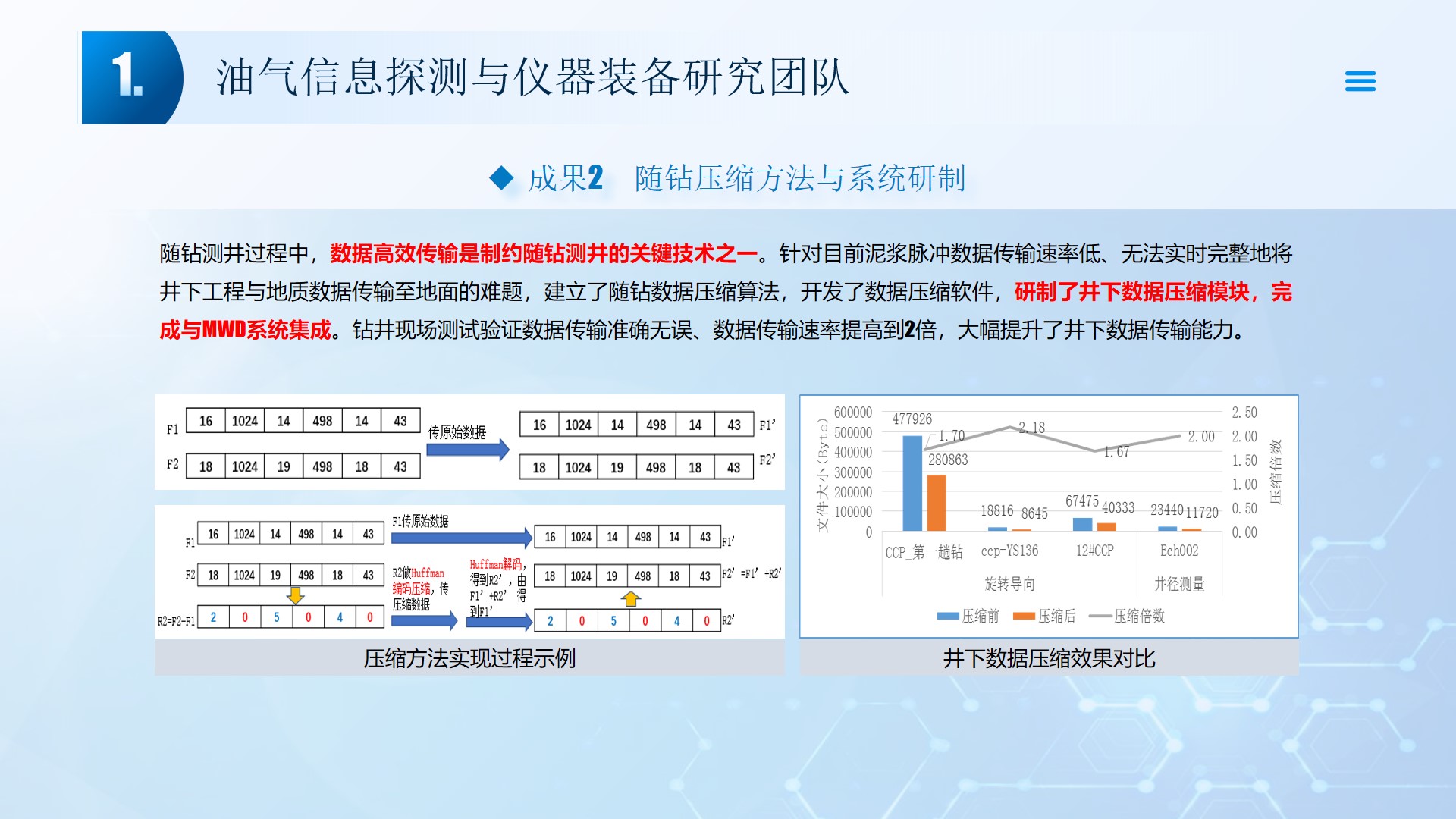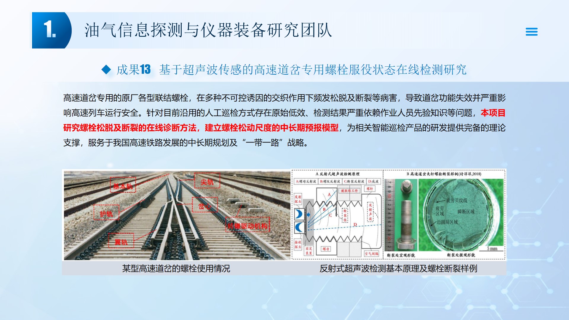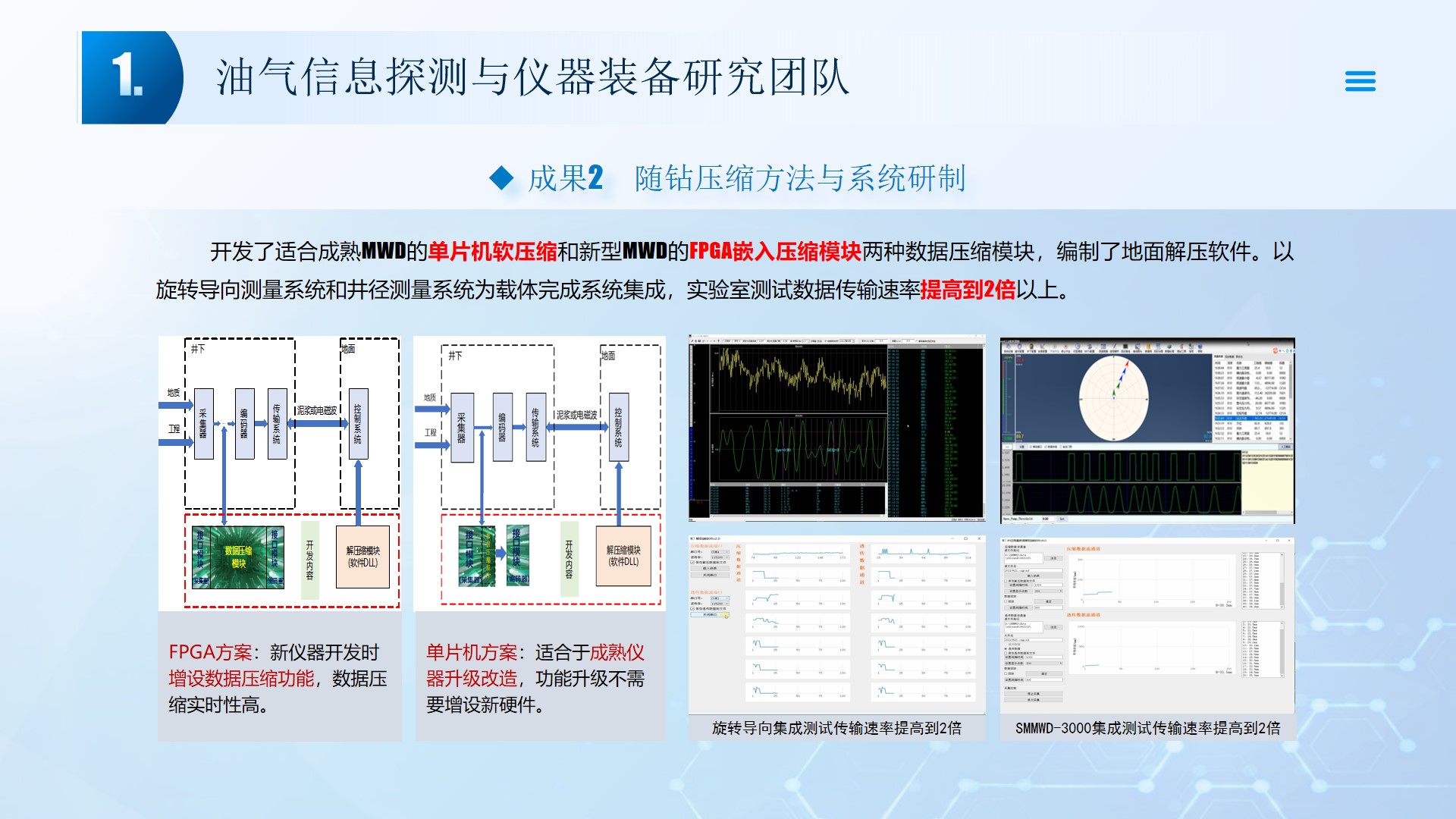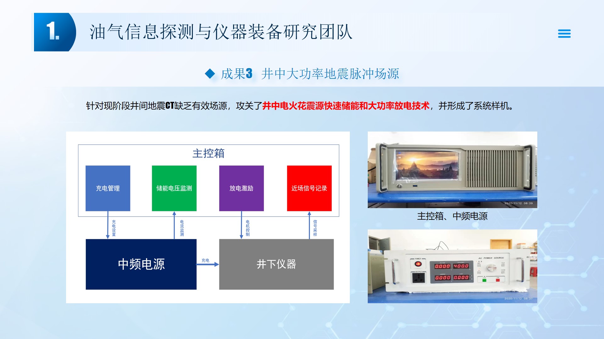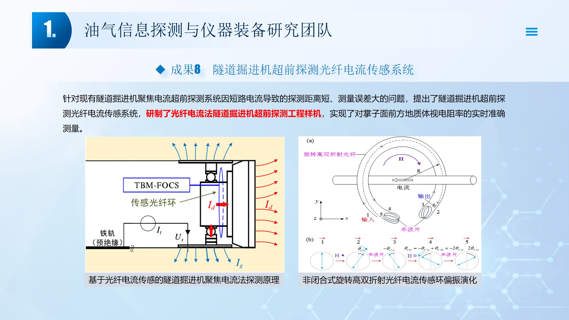 围绕声、电探测关键技术(传感器、声传播理论、仪器装备、数据处理及解释等),团队成员主持国家自然科学基金4项、湖北省自然科学基金6项、中石油创新基金4项及横向课题100余项。在《中国科学:地球科学》、《 Journal of petroleum science and engineering 》等石油领域权威学术期刊发表论文200多篇,出版专著4部,授权专利20余项;获省部级科技进步奖5项。团队开展了全频段、多尺度声波传感器及声学探测方法研究,并将相关技术整合研发了系列装备,以随钻井径测量系统、随钻数据压缩系统、远探测信号激励系统、多功能井下信号格式转换短节、便携式电火花震源、气枪控制系统为代表的成果已在油田现场取得了良好的应用效果。